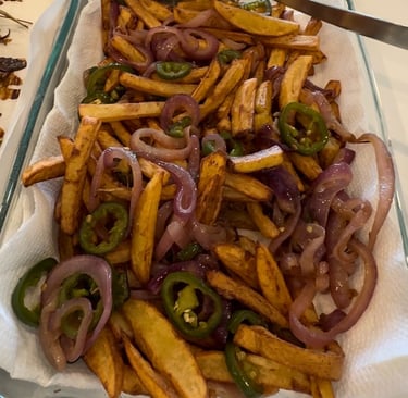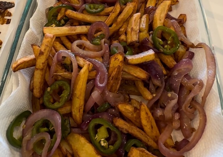 Pomme Frites topped with sauteed Sliced Onions and Jalapenos