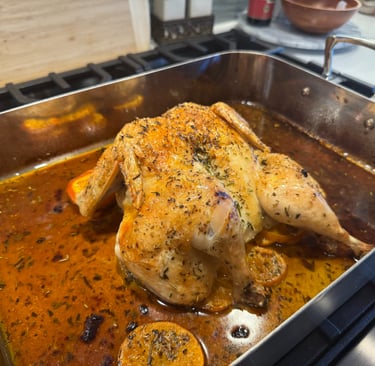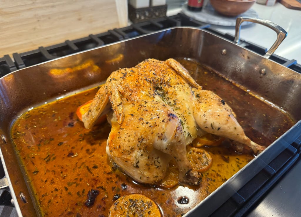 A delicious citrus and white wine roasted chicken that only takes 10 minutes of prep time. Inspired by Coco Larkin.